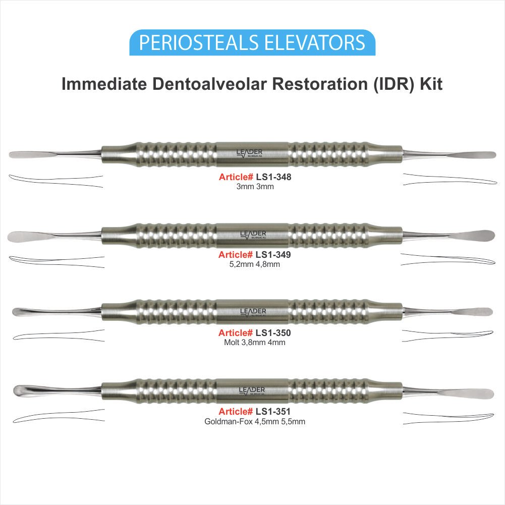 Oral and maxillofacial surgeons use the IDR Kit – Immediate Dentoalveolar Restoration during immediate implant placement in compromised sockets. Molt and periosteal elevator tips reflect mucoperiosteal tissue and debride infected socket walls, while Goldman-Fox variants trim soft tissue margins. Surgeons apply this kit specifically during single-stage flapless socket reconstruction — placing the implant, packing autologous bone graft, and seating a provisional restoration within one operative appointment.